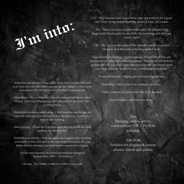 - femdom, findom, tattoos, mistress, sph, worship, cbt, piercings, tattooed, owner, goth, sadist, keyholder, trainer, humillatrix, sissyfication, gothdom, advicer, mesmerising, analtrainer, fastresponse