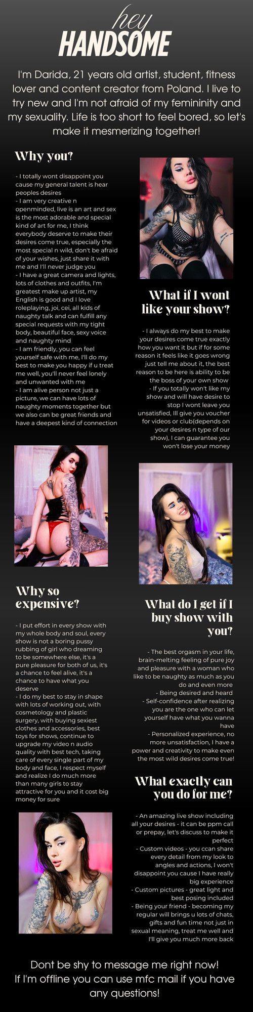 You can ASK FOR A DATE with Darida at your convenience. Everything is in your timezone, your local hours. She will receive your request and accept it if her schedule is free. You will receive a confirmation via email and you can prepare for your hot experience.